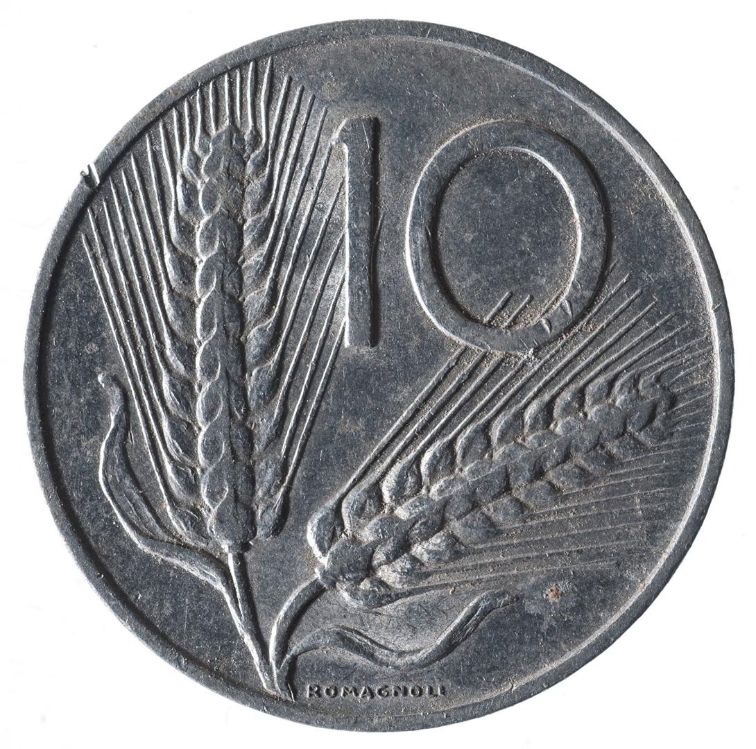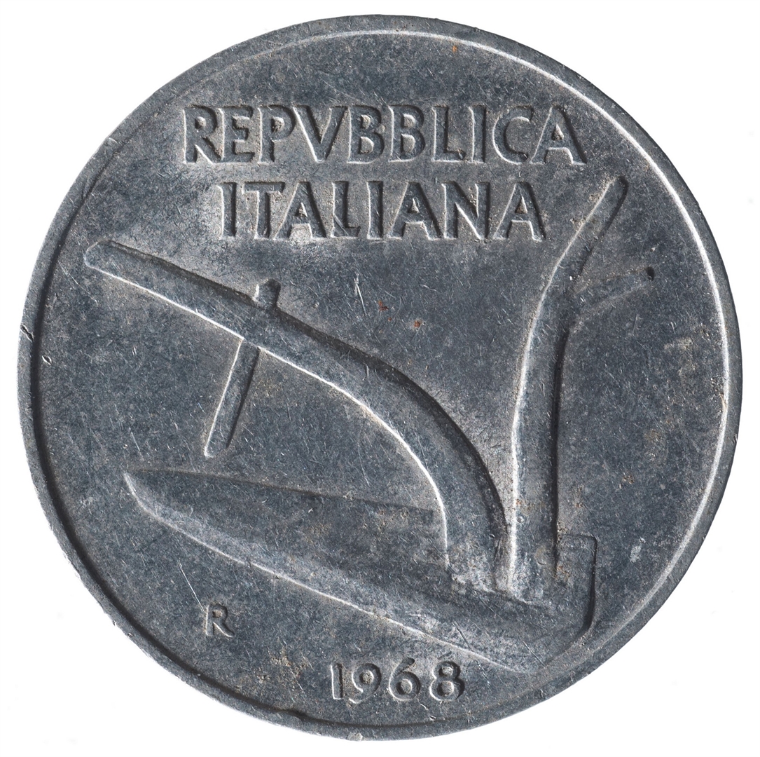 Centralni dio zauzima prikaz pluga iznad kojeg se nalazi tekst u dva reda REPUBLICA ITALIANA. Ispod pluga nalazi se slovo R i godina kovanja.