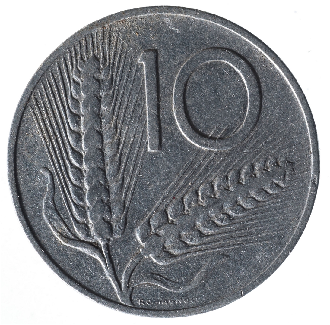 Centralni dio zauzima prikaz pluga iznad kojeg se nalazi tekst u dva reda REPUBLICA ITALIANA. Ispod pluga nalazi se slovo R i godina kovanja.