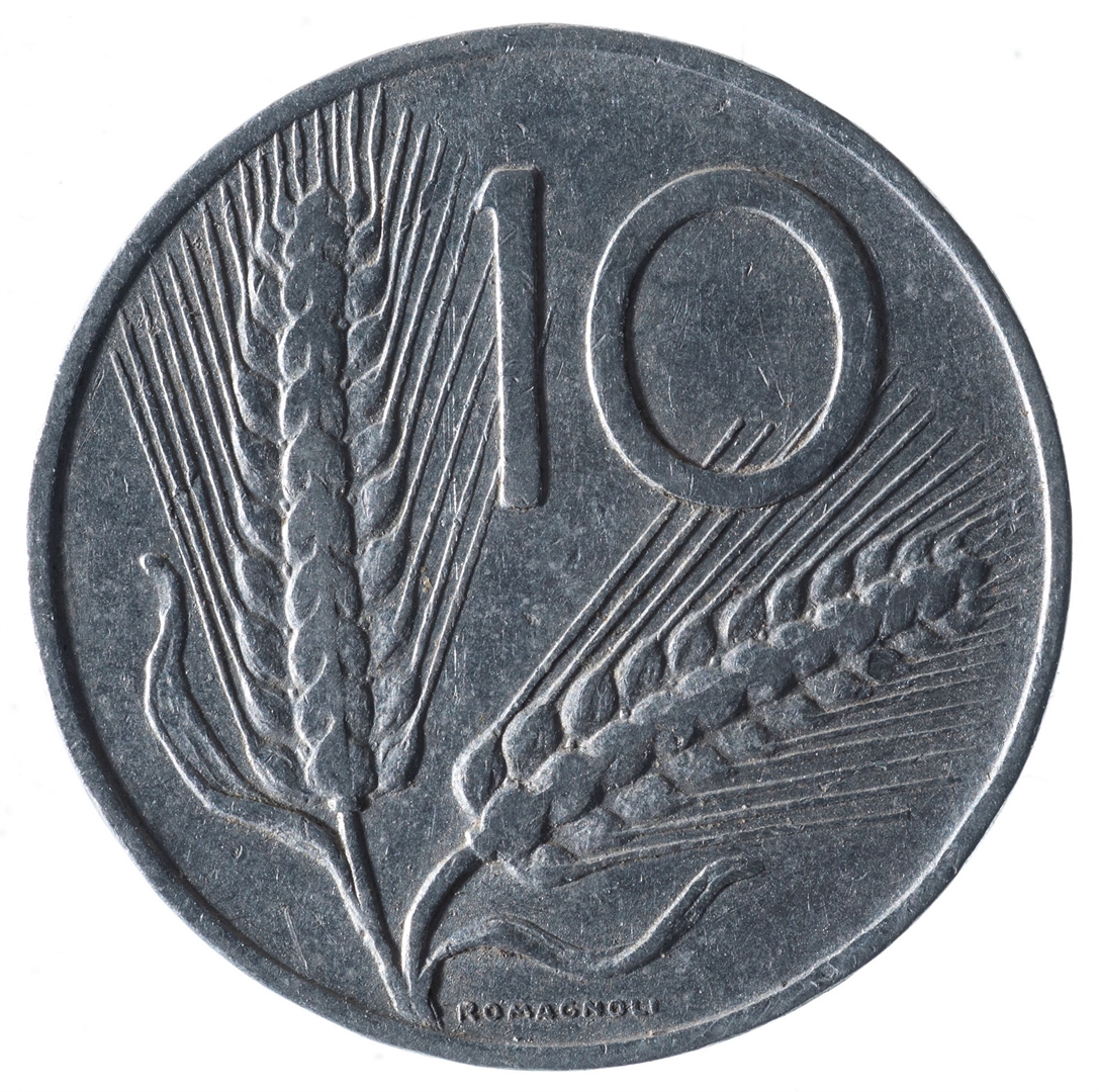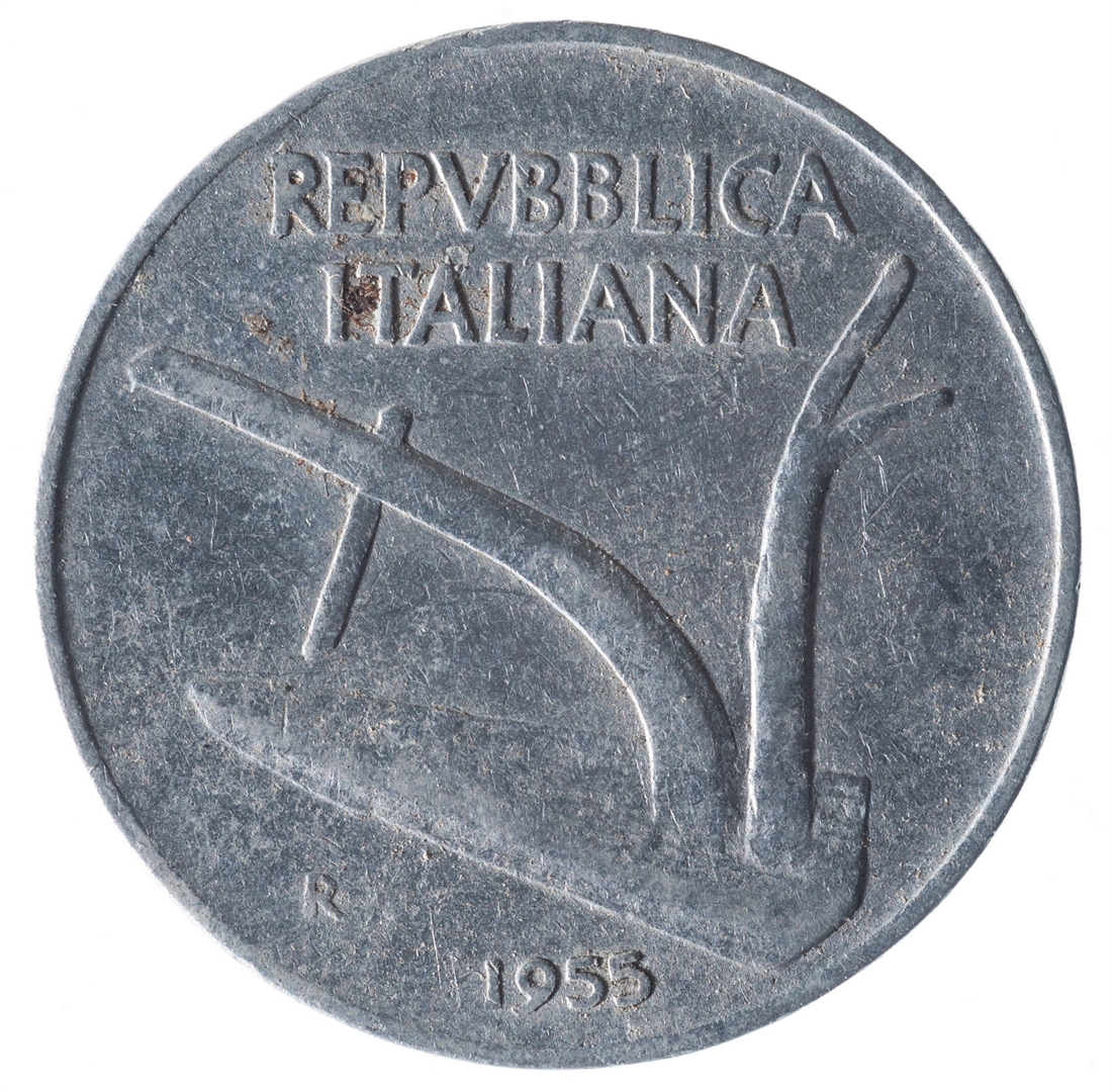 Centralni dio zauzima prikaz pluga iznad kojeg se nalazi tekst u dva reda REPUBLICA ITALIANA. Ispod pluga nalazi se slovo R i godina kovanja.