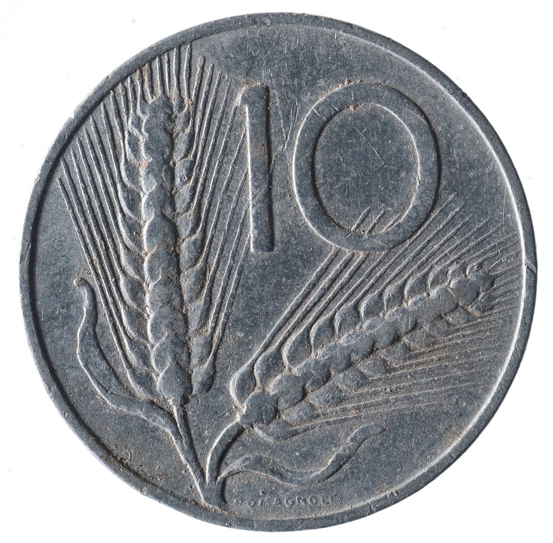 Centralni dio zauzima prikaz pluga iznad kojeg se nalazi tekst u dva reda REPUBLICA ITALIANA. Ispod pluga nalazi se slovo R i godina kovanja.