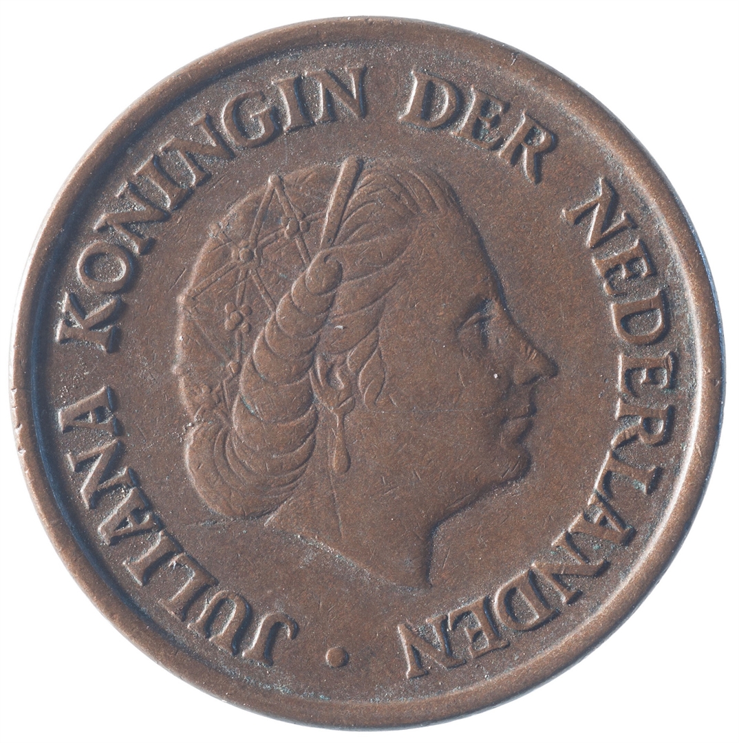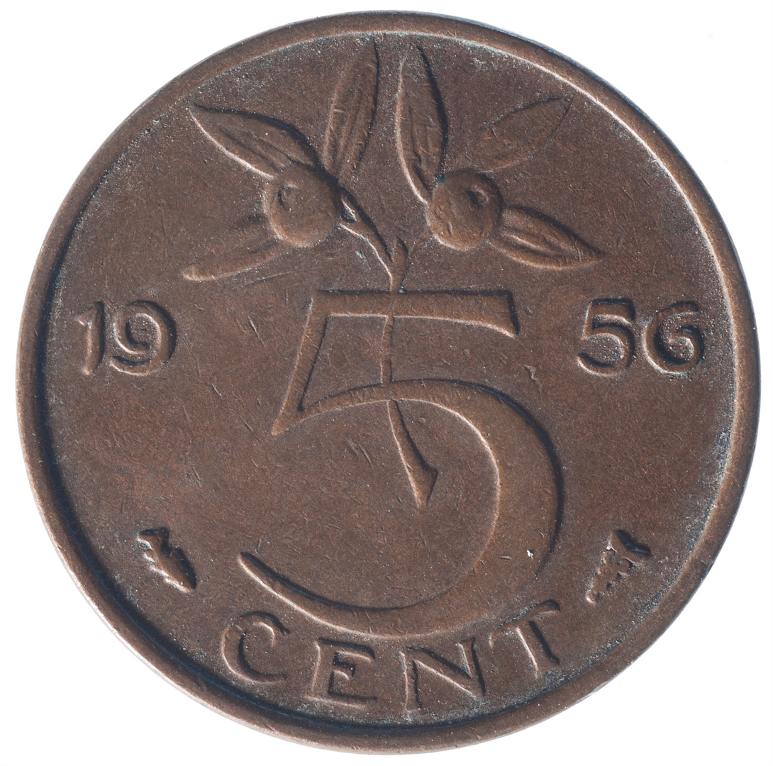 Avers: U sredini profil kraljice okrenut udesno. Kružno uz rub natpis JULIANA KONINGIN DER NEDERLENDEN. Revers: U sredini broj 5, a sa lijeve i desne strane u dva djela godina kovanja 19 56. iznad grana naranče a na dnu natpis CENT.