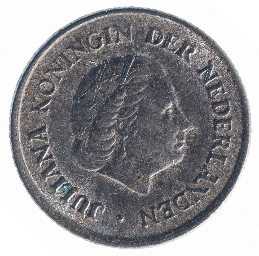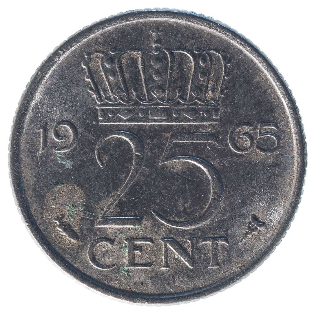 Avers: U sredini profil kraljice okrenut udesno. Kružno uz rub natpis JULIANA KONINGIN DER NEDERLENDEN. Revers: U sredini broj 25, a sa lijeve i desne strane u dva djela godina kovanja 19 65. iznad kruna a na dnu natpis CENT.