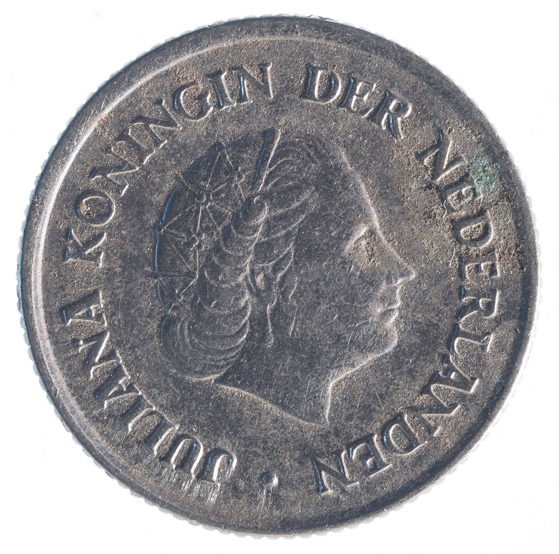 U sredini profil kraljice okrenut udesno. Kružno uz rub natpis JULIANA KONINGIN DER NEDERLENDEN.