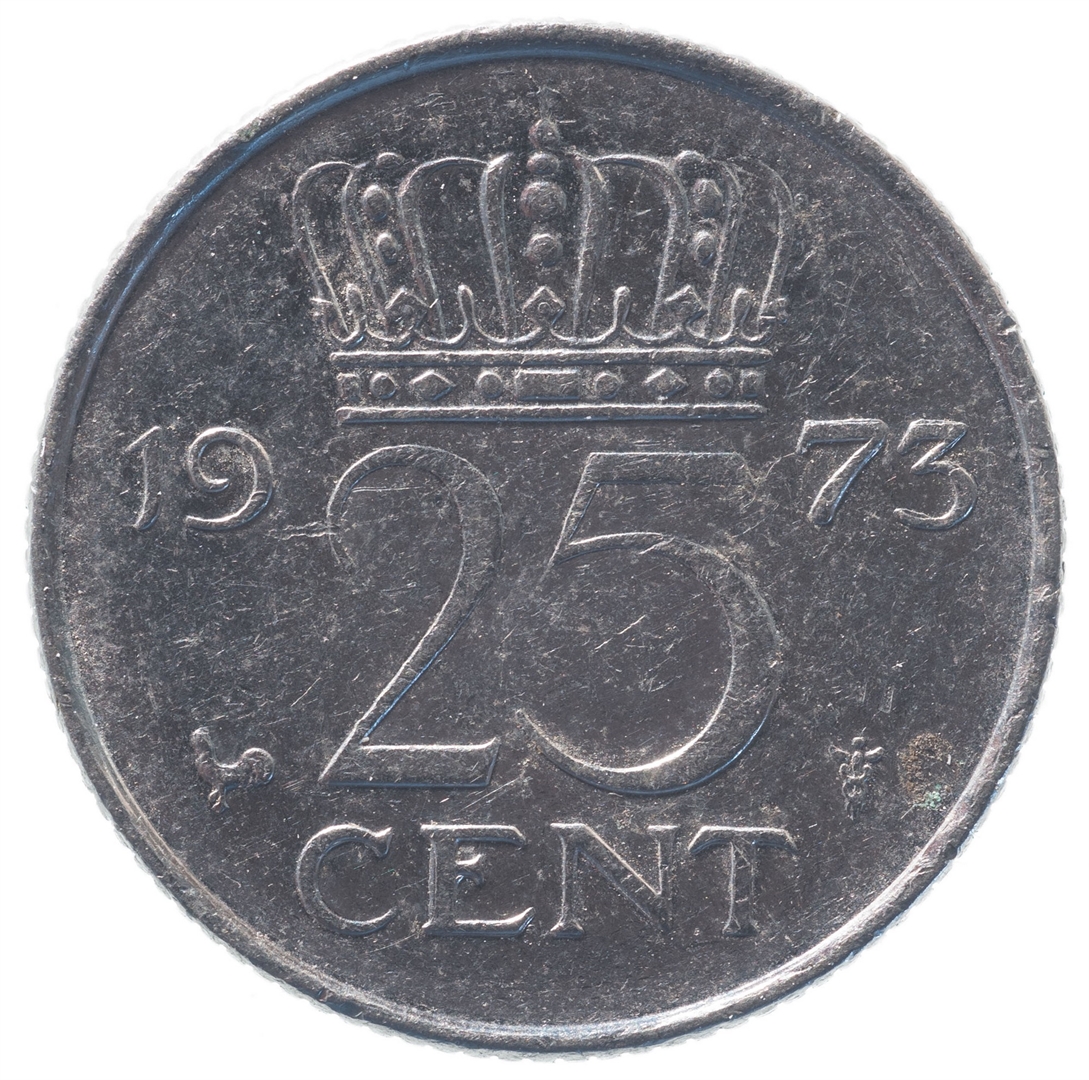 Avers: U sredini profil kraljice okrenut udesno. Kružno uz rub natpis JULIANA KONINGIN DER NEDERLENDEN. Revers: U sredini broj 25, a sa lijeve i desne strane u dva djela godina kovanja 19 73. iznad kruna a na dnu natpis CENT.