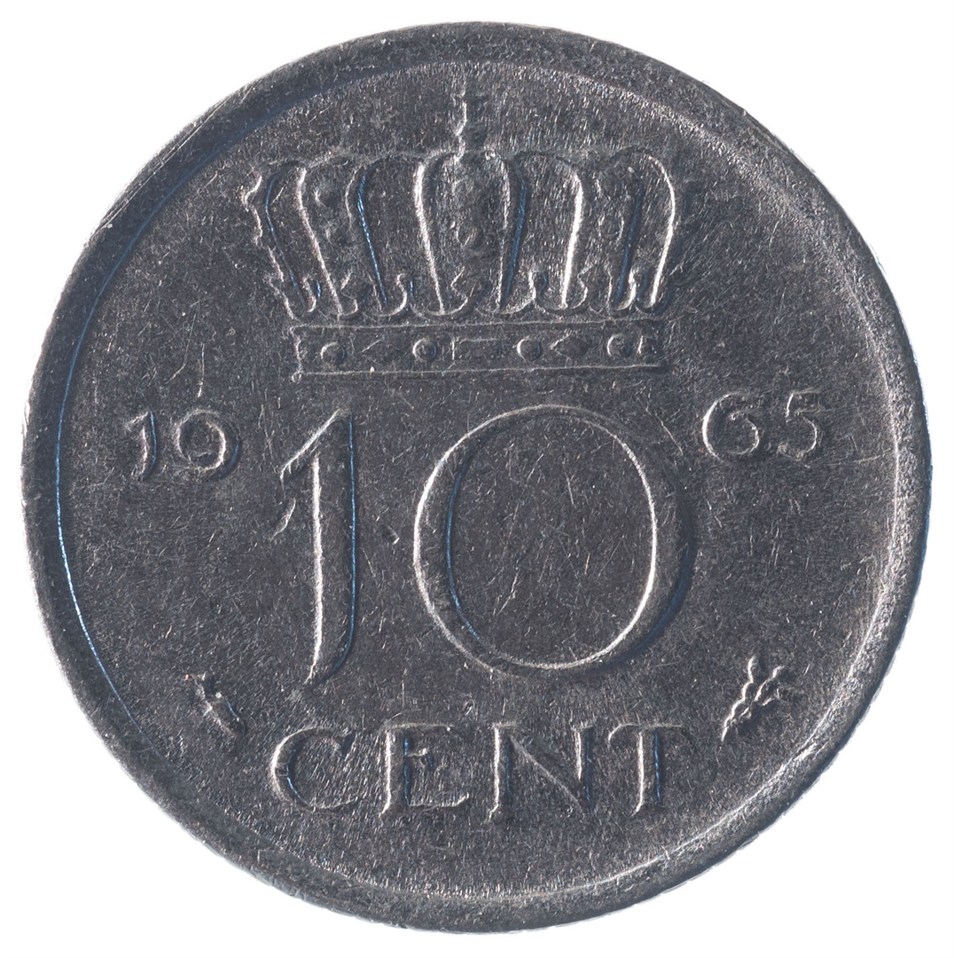 Avers: U sredini profil kraljice okrenut udesno. Kružno uz rub natpis JULIANA KONINGIN DER NEDERLENDEN. Revers: U sredini broj 10, a sa lijeve i desne strane u dva djela godina kovanja 19 65. iznad kruna a na dnu natpis CENT.