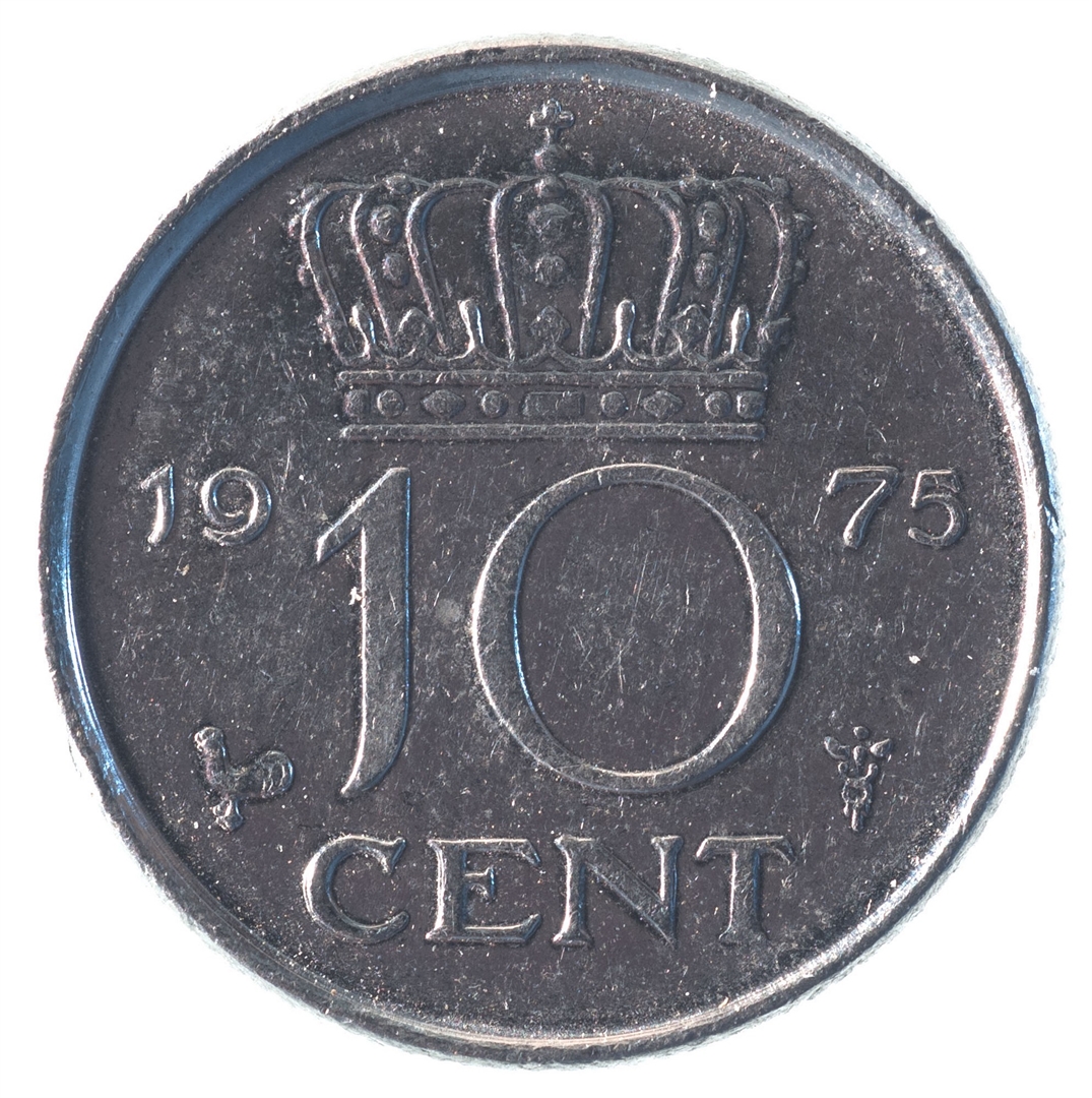 Avers: U sredini profil kraljice okrenut udesno. Kružno uz rub natpis JULIANA KONINGIN DER NEDERLENDEN. Revers: U sredini broj 10, a sa lijeve i desne strane u dva djela godina kovanja 19 75. iznad kruna a na dnu natpis CENT.
