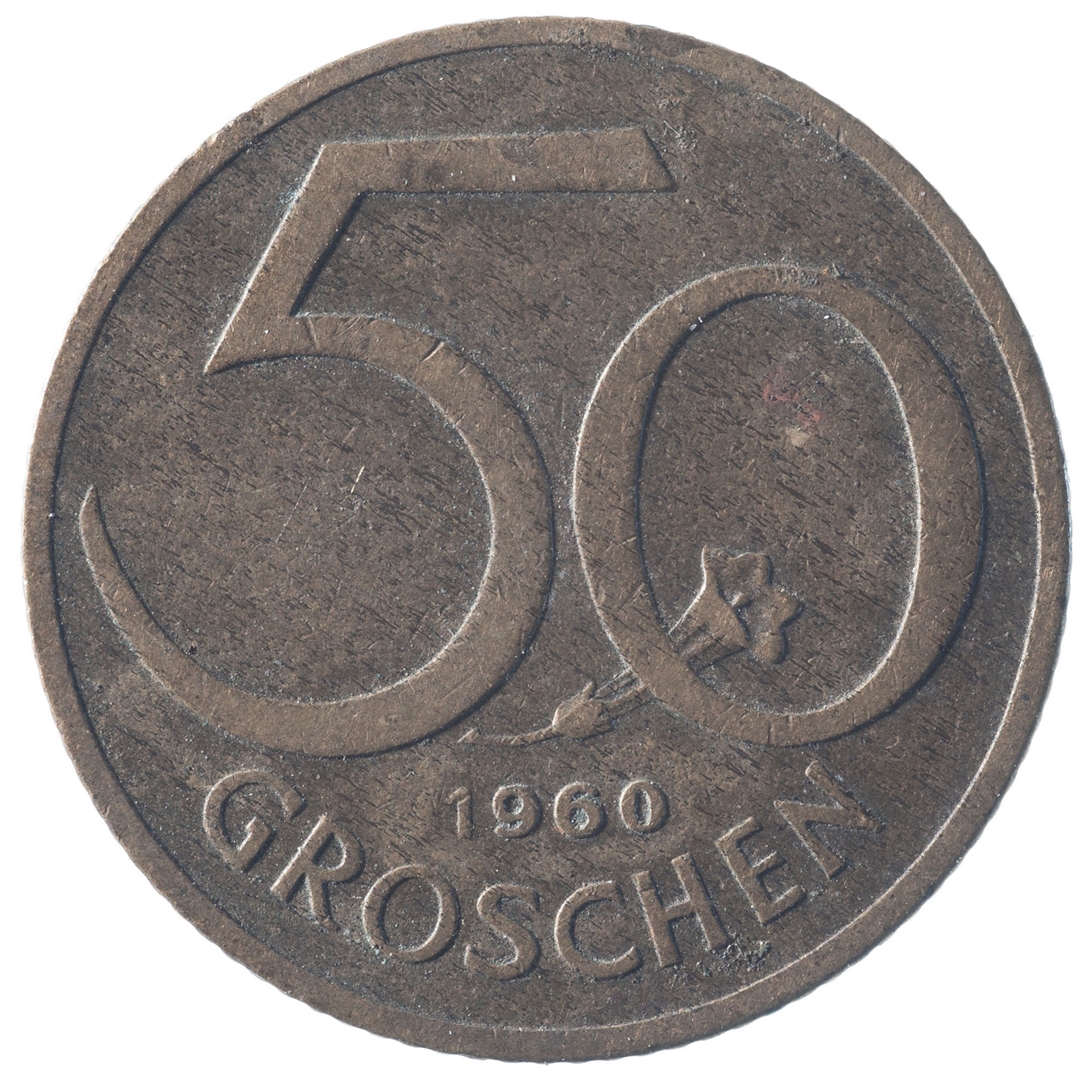 Avers: U sredini državni grb. Kružno uz rub tekst REPUBLIK ''O''STERREICH. Revers: Veliki broj 50 u čijem se dnu nalazi cvijet. Ispod godina kovanja (1960) i tekst GROSCHEN.