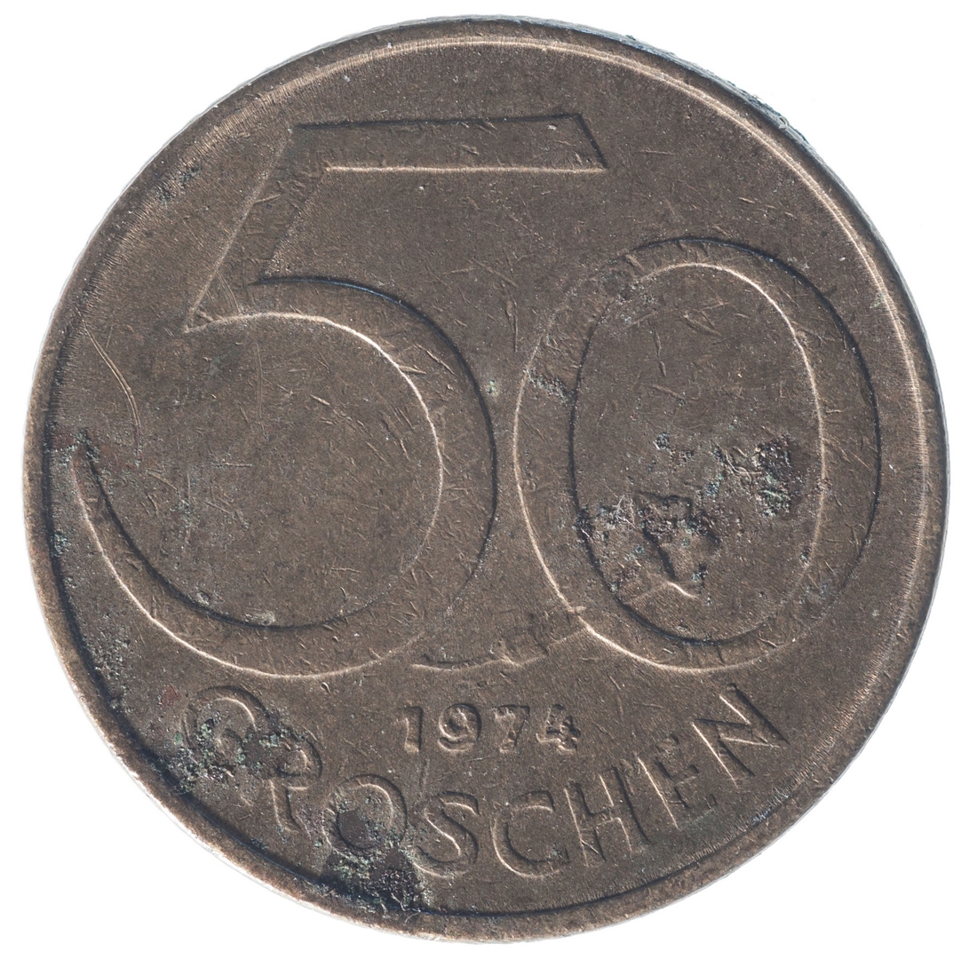 Veliki broj 50 u čijem se dnu nalazi cvijet. Ispod godina kovanja (1974) i tekst GROSCHEN.