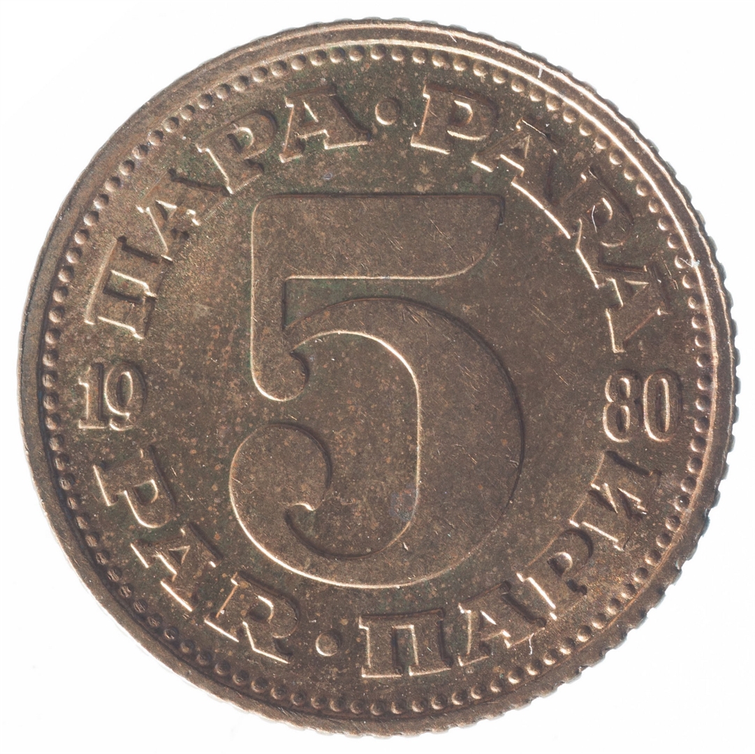 U sredini broj 5 (nominala), a oko njega tekst PARA na četiri jezika. U sredini uz lijevi i desni rub upisana godina 1980.