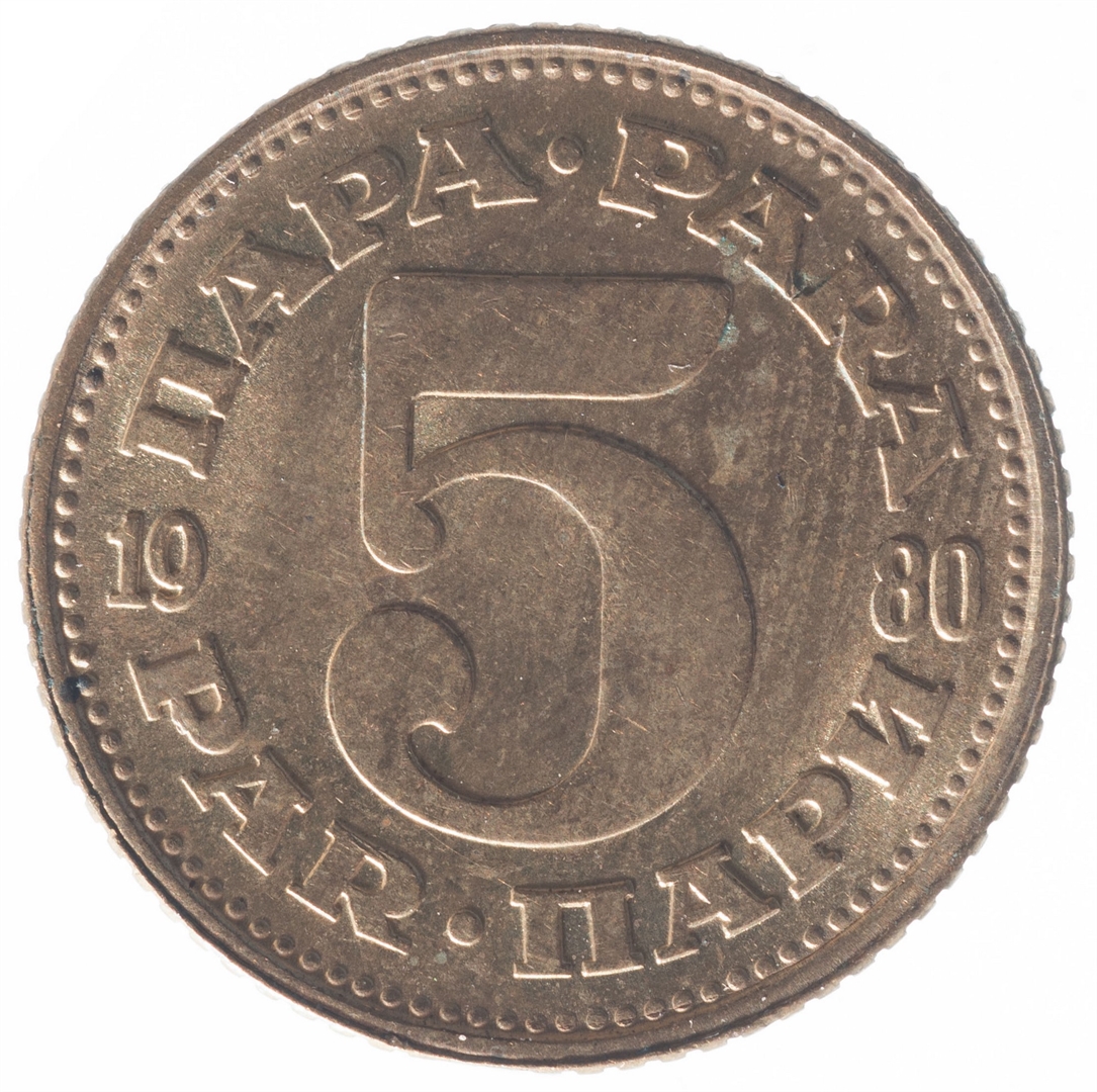 Avers: U sredini državni grb. U gornjem djelu uz rub polukružno napisan tekst SFR JUGOSLAVIJA na latinici i ćirilici. Revers: U sredini broj 5 (nominala), a oko njega tekst PARA na četiri jezika. U sredini uz lijevi i desni rub upisana godina 1980.