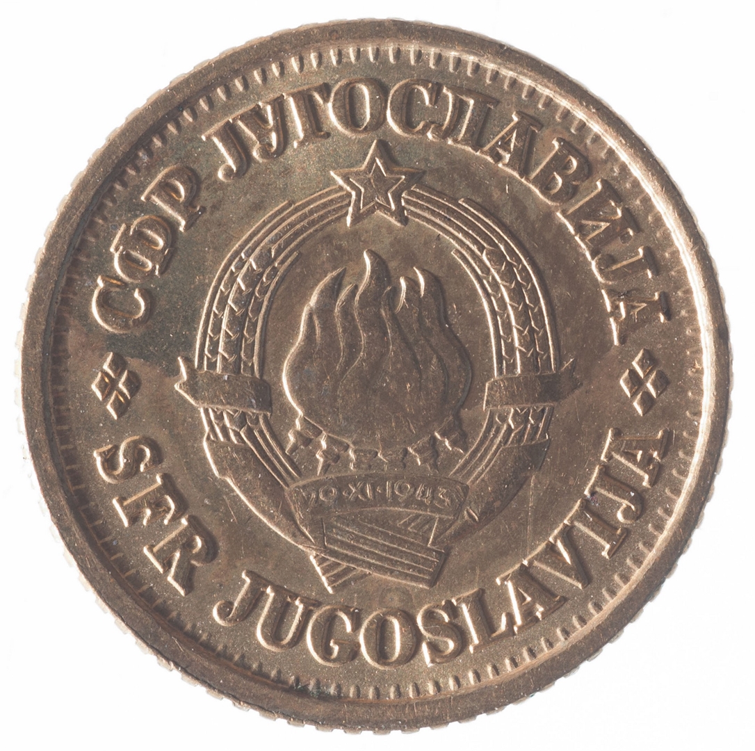 U sredini državni grb. U gornjem djelu uz rub polukružno napisan tekst SFR JUGOSLAVIJA na latinici i ćirilici.