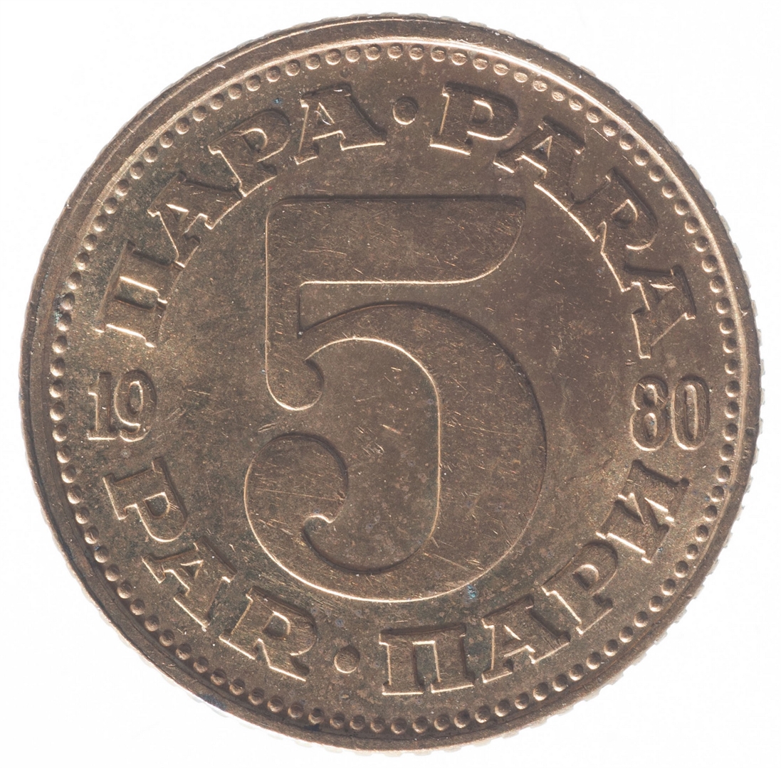 U sredini broj 5 (nominala), a oko njega tekst PARA na četiri jezika. U sredini uz lijevi i desni rub upisana godina 1980.