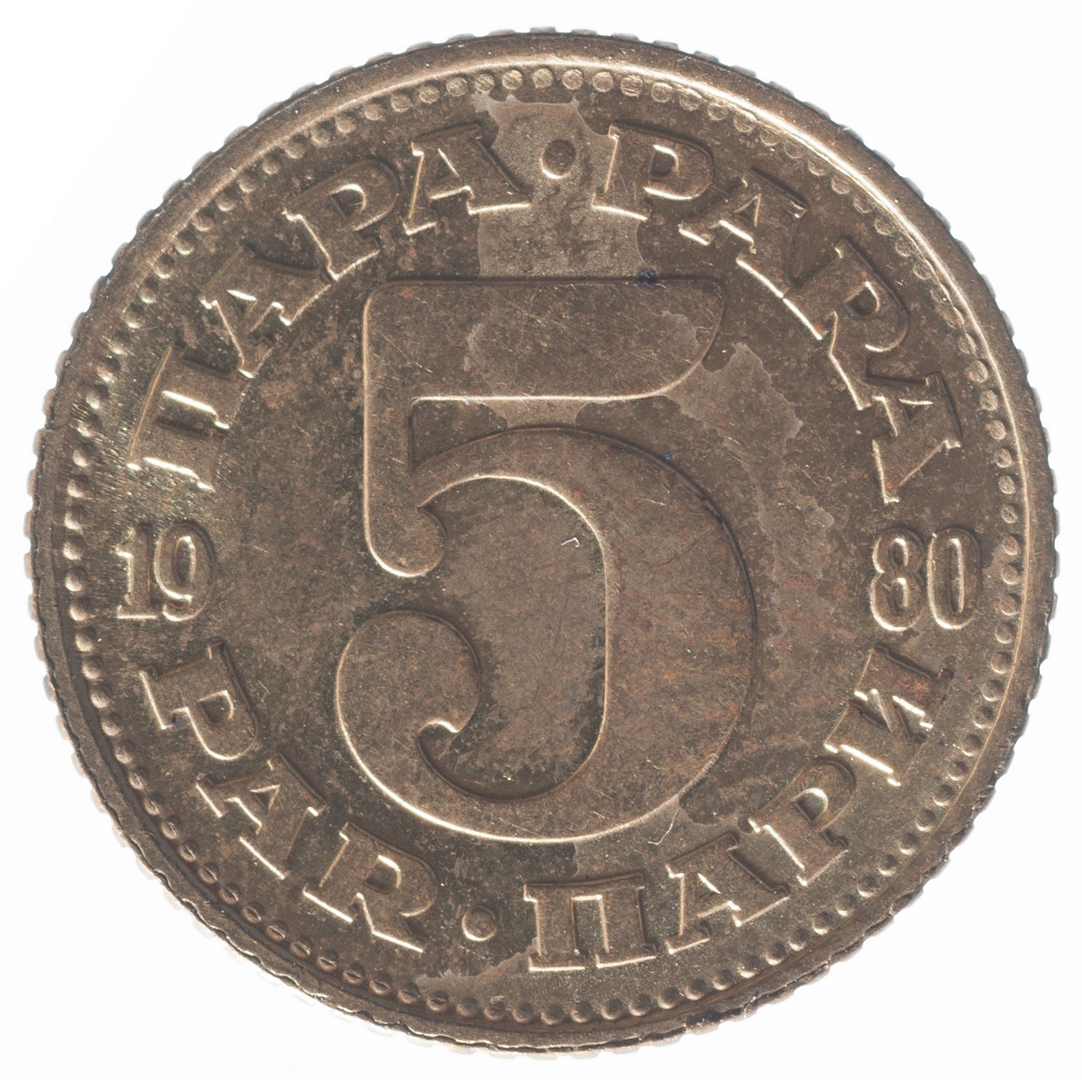 U sredini broj 5 (nominala), a oko njega tekst PARA na četiri jezika. U sredini uz lijevi i desni rub upisana godina 1980.