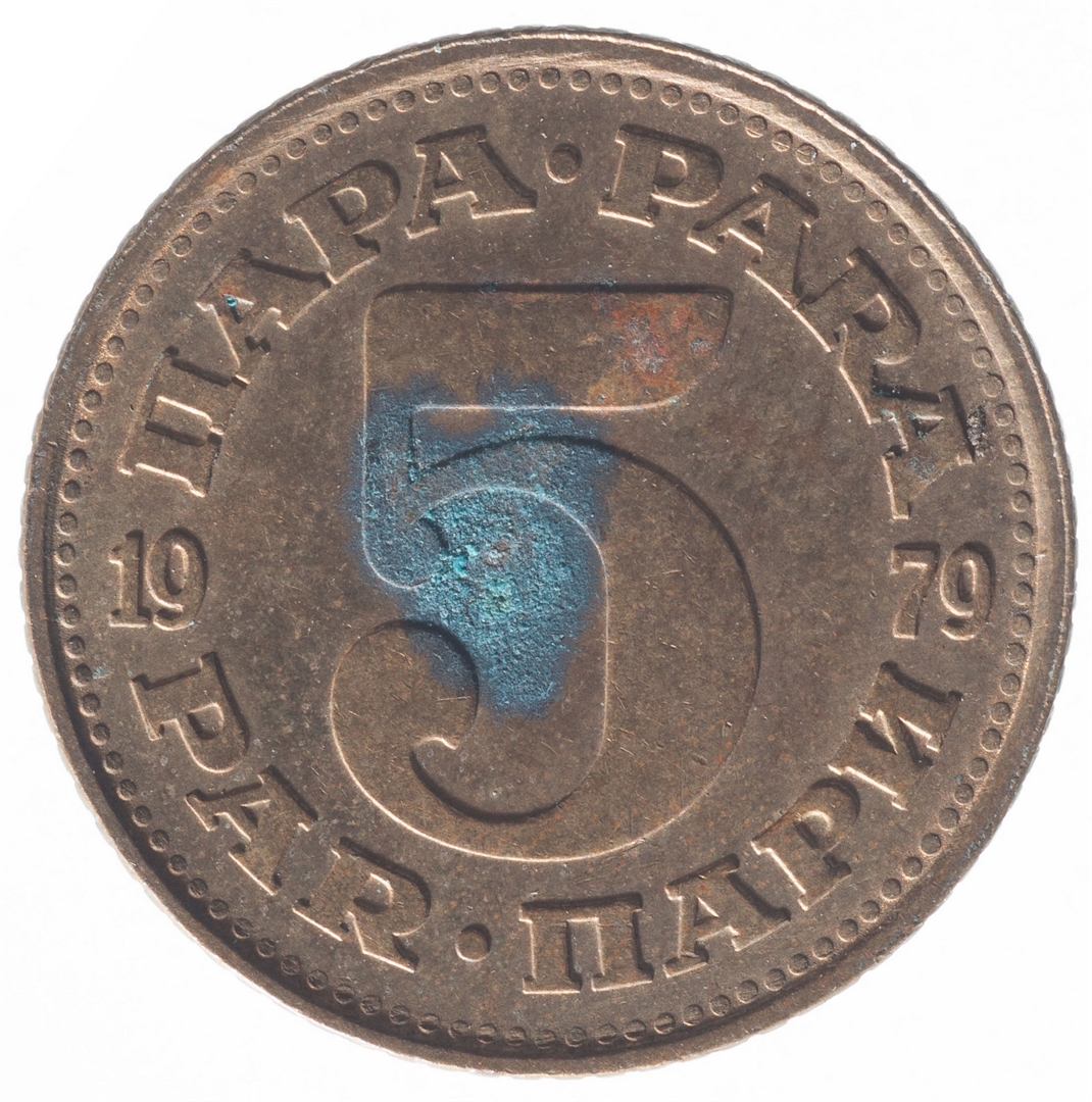 U sredini broj 5 (nominala), a oko njega tekst PARA na četiri jezika. U sredini uz lijevi i desni rub upisana godina 1979.