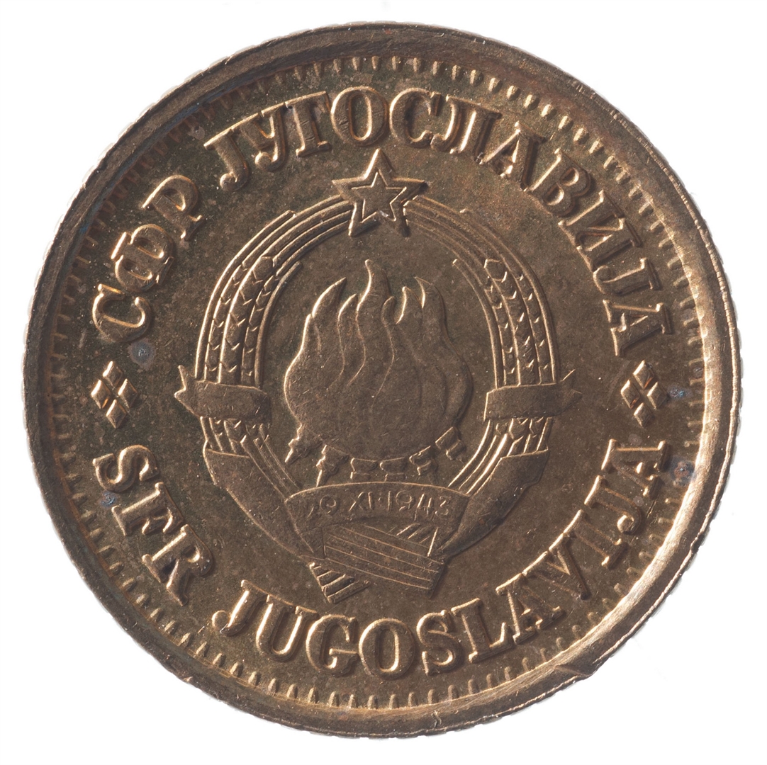 U sredini državni grb. U gornjem djelu uz rub polukružno napisan tekst SFR JUGOSLAVIJA na latinici i ćirilici.