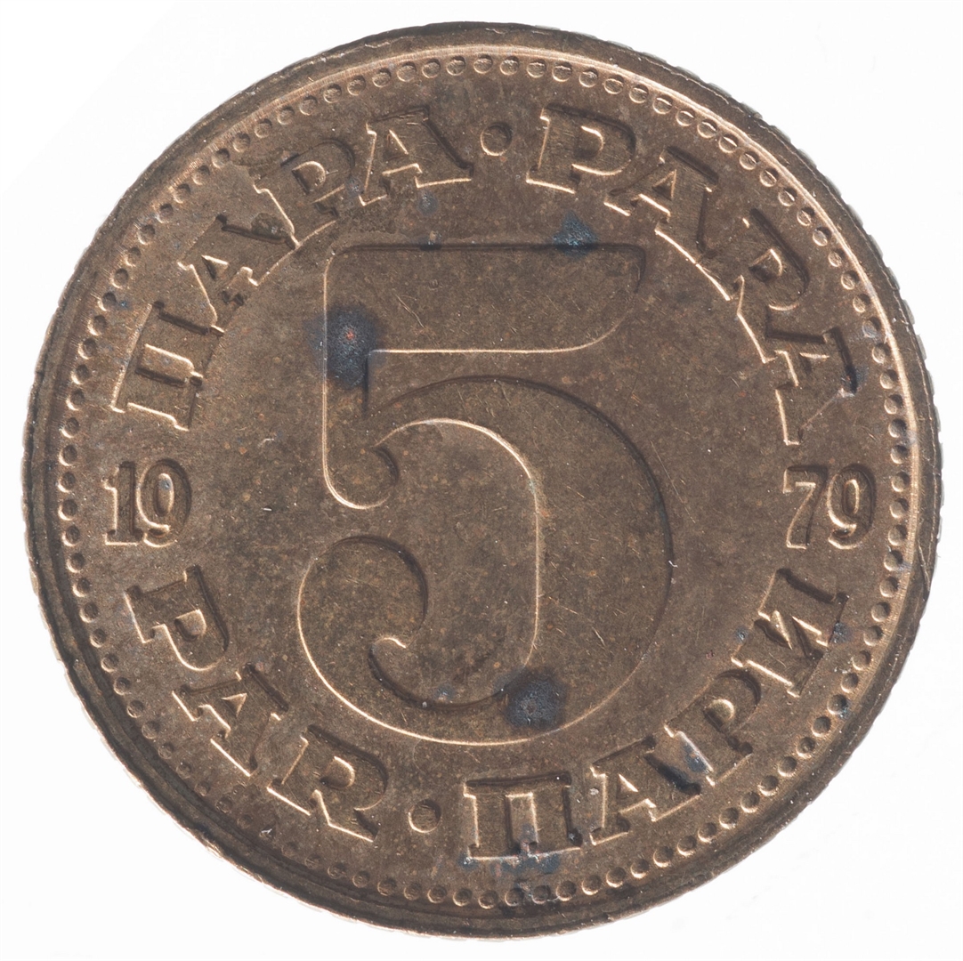 U sredini broj 5 (nominala), a oko njega tekst PARA na četiri jezika. U sredini uz lijevi i desni rub upisana godina 1979.