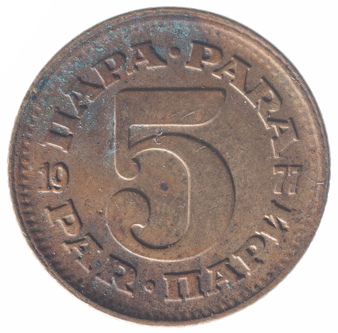 Avers: U sredini državni grb. U gornjem djelu uz rub polukružno napisan tekst SFR JUGOSLAVIJA na latinici i ćirilici. Revers: U sredini broj 5 (nominala), a oko njega tekst PARA na četiri jezika. U sredini uz lijevi i desni rub upisana godina 1977.