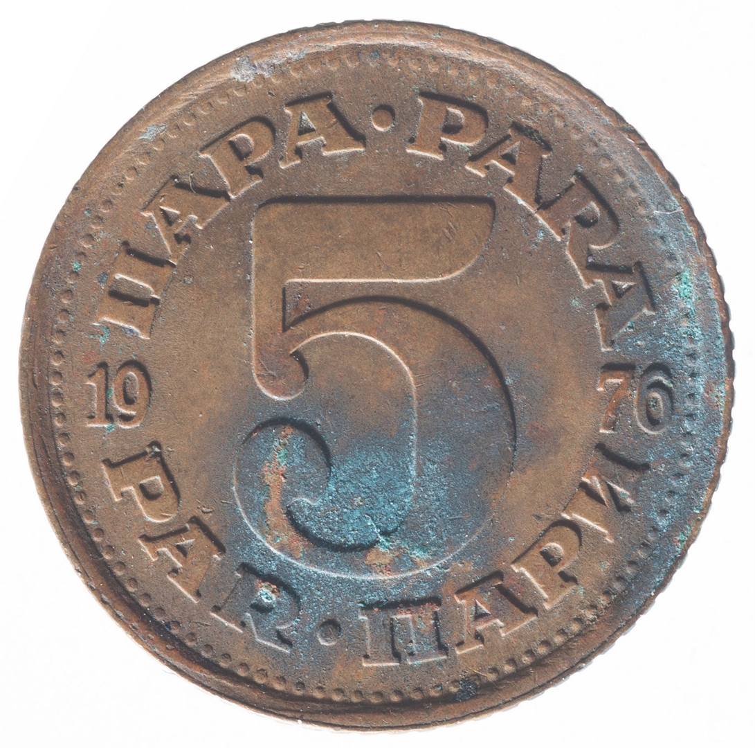 U sredini broj 5 (nominala), a oko njega tekst PARA na četiri jezika. U sredini uz lijevi i desni rub upisana godina 1976.