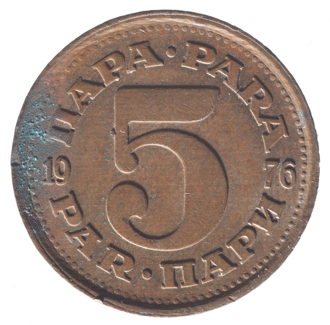 U sredini broj 5 (nominala), a oko njega tekst PARA na četiri jezika. U sredini uz lijevi i desni rub upisana godina 1976.