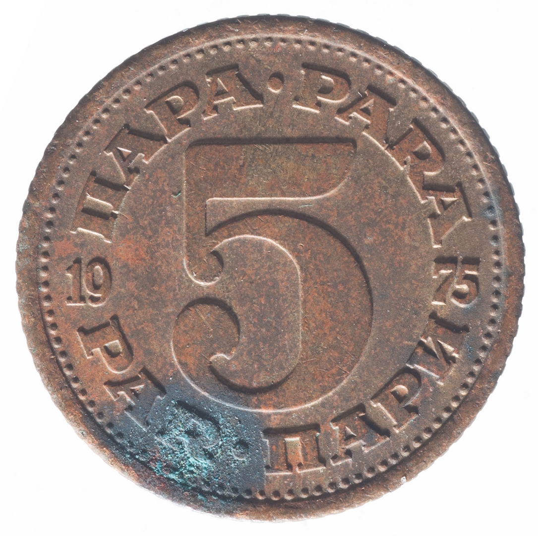 U sredini broj 5 (nominala), a oko njega tekst PARA na četiri jezika. U sredini uz lijevi i desni rub upisana godina 1975.
