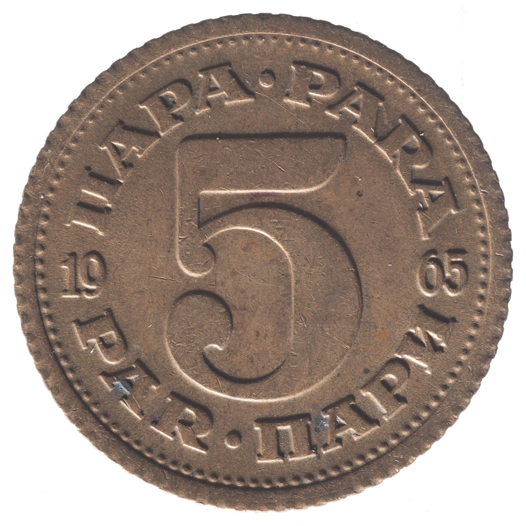 Avers: U sredini državni grb. U gornjem djelu uz rub polukružno napisan tekst SFR JUGOSLAVIJA na latinici i ćirilici. Revers: U sredini broj 5 (nominala), a oko njega tekst PARA na četiri jezika. U sredini uz lijevi i desni rub upisana godina 1965.