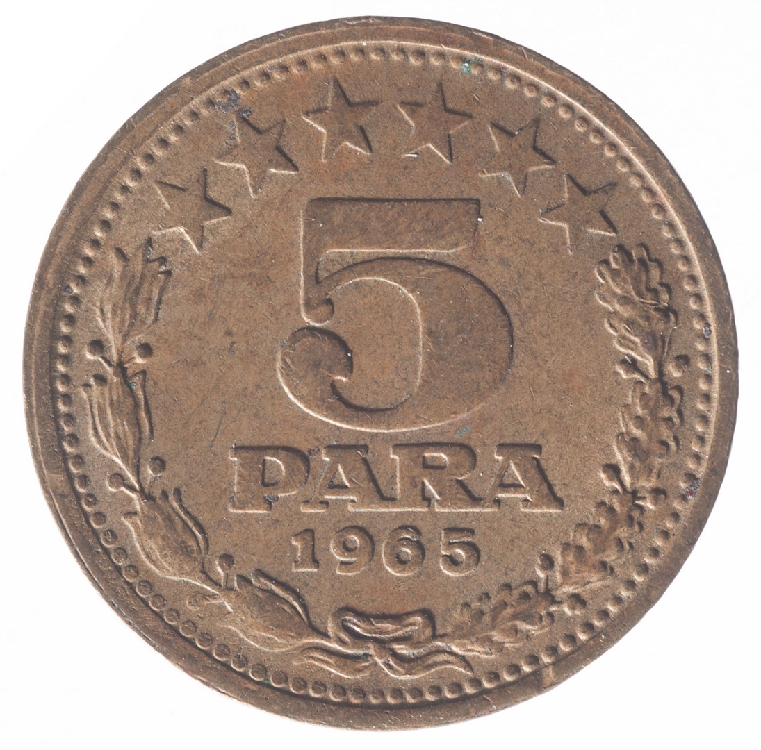 U sredini broj 5 (nominala), a ispod njega tekst PARA i godina 1965. Duž cijelog gornjeg ruba polukružno poredano 6 petokrakih zvjezdi.