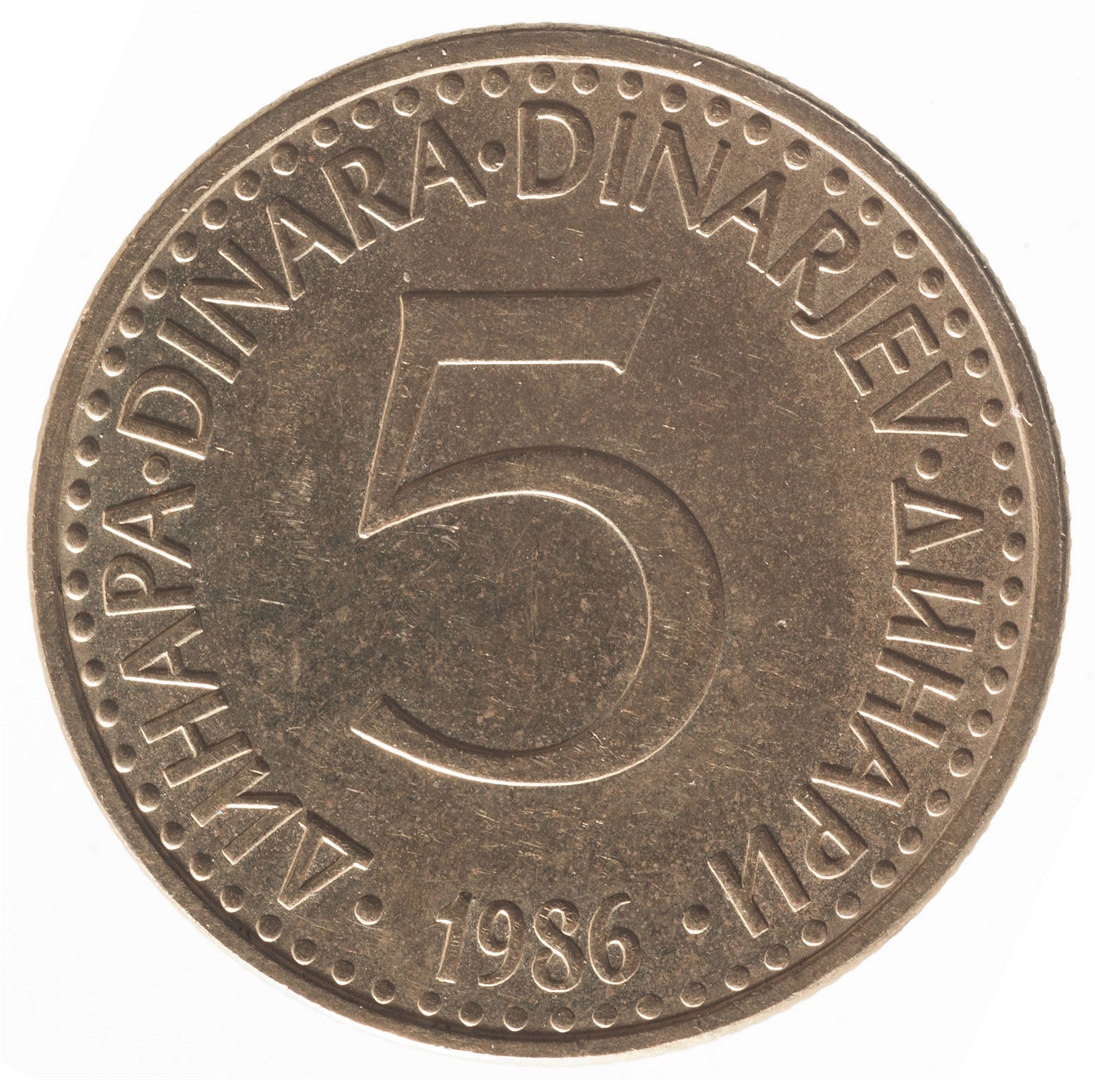 U sredini broj 5 (nominala), oko njega tekst DINAR na četiri jezika, a ispod toga godina 1986.