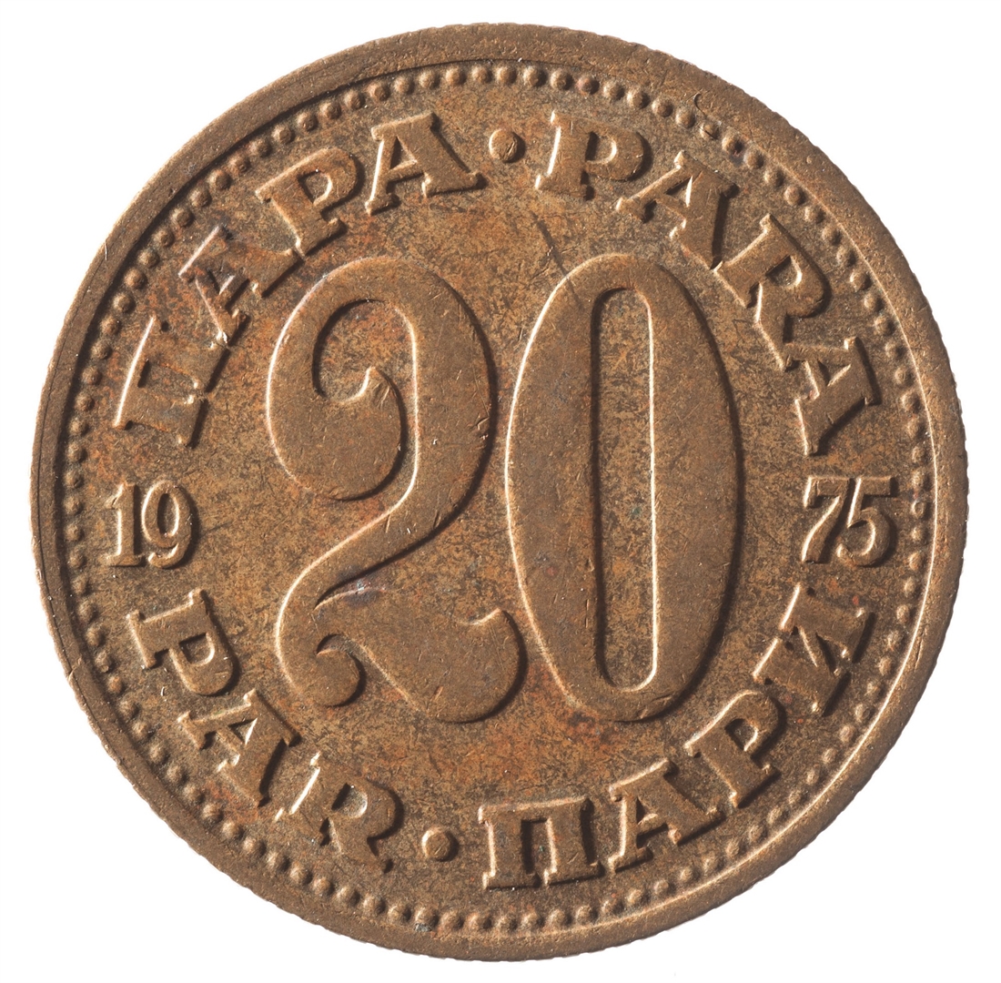 U sredini broj 20 (nominala), a oko njega tekst PARA na četiri jezika. U sredini uz lijevi i desni rub upisana godina 1975.