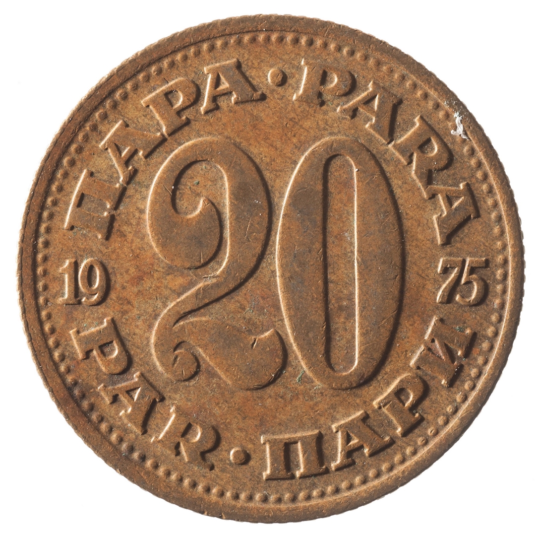 Avers: U sredini državni grb. U gornjem djelu uz rub polukružno napisan tekst SFR JUGOSLAVIJA na latinici i ćirilici. Revers: U sredini broj 20 (nominala), a oko njega tekst PARA na četiri jezika. U sredini uz lijevi i desni rub upisana godina 1975.