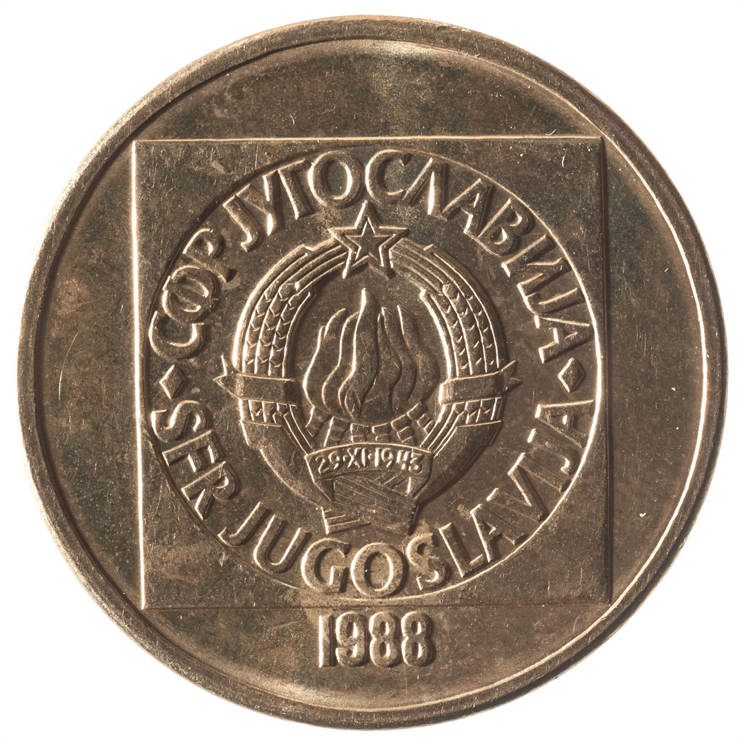 U sredini unutar četverokuta državni grb, a oko njega uz rub polukružno napisan tekst SFR JUGOSLAVIJA na latinici i ćirilici. Ispod godina 1988.
