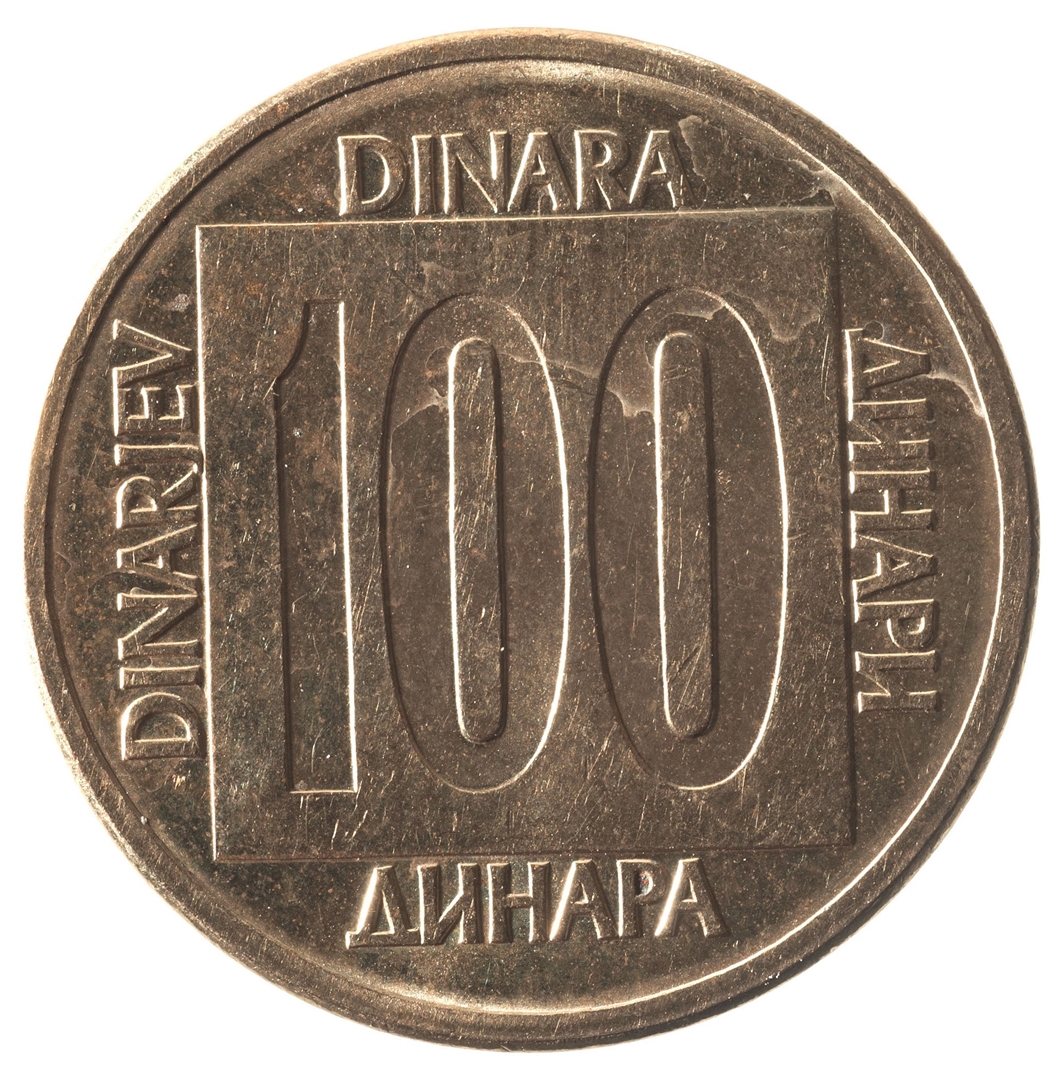 U sredini četverokuta broj 100 (nominala), oko njega tekst DINAR na četiri jezika.