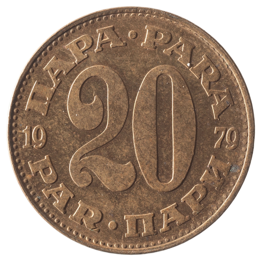 U sredini broj 20 (nominala), a oko njega tekst PARA na četiri jezika. U sredini uz lijevi i desni rub upisana godina 1979.