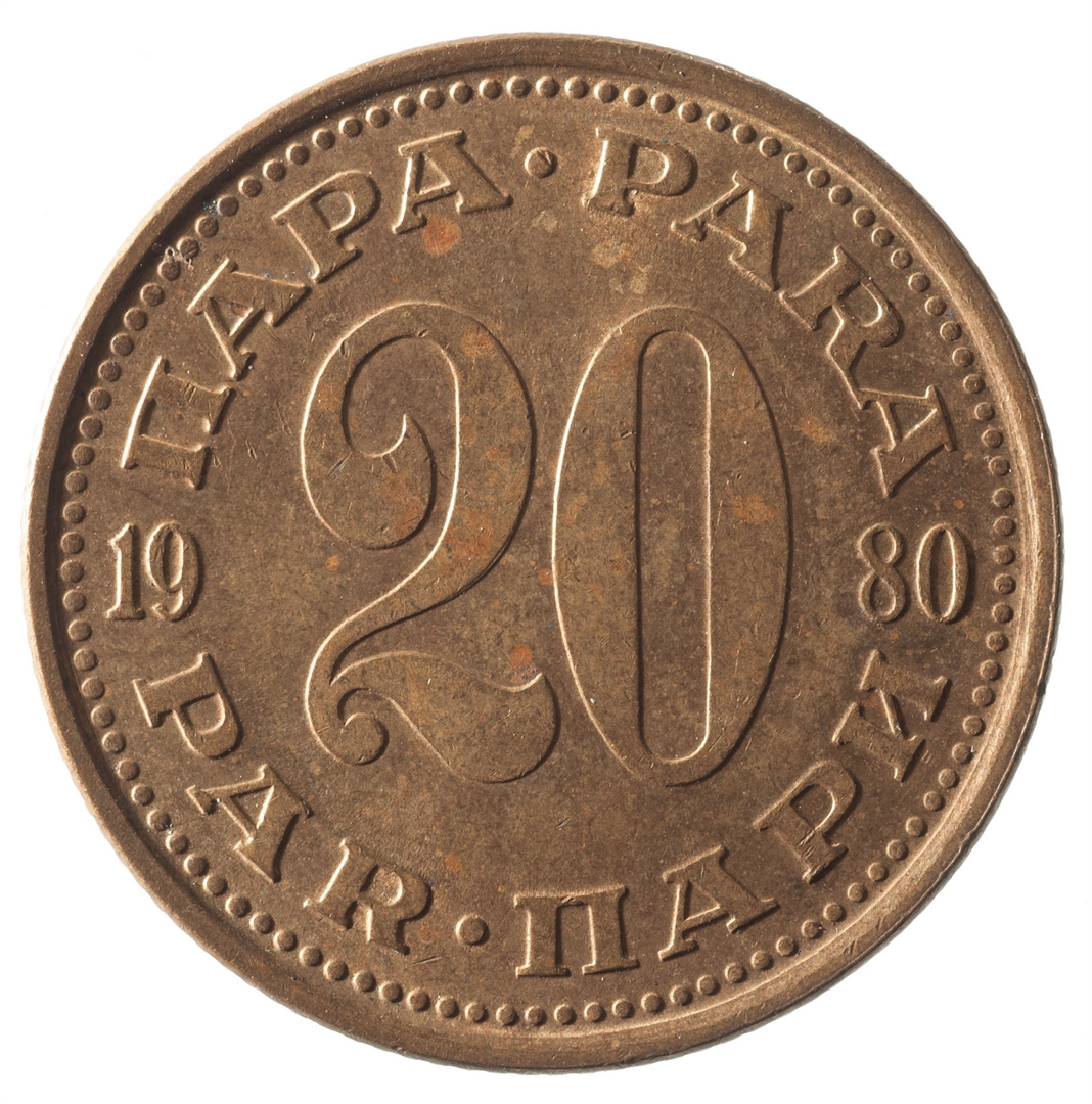 U sredini broj 20 (nominala), a oko njega tekst PARA na četiri jezika. U sredini uz lijevi i desni rub upisana godina 1980.