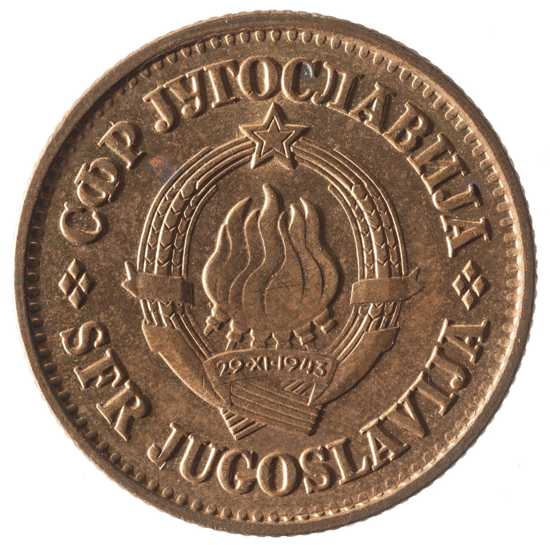 U sredini državni grb. U gornjem djelu uz rub polukružno napisan tekst SFR JUGOSLAVIJA na latinici i ćirilici.