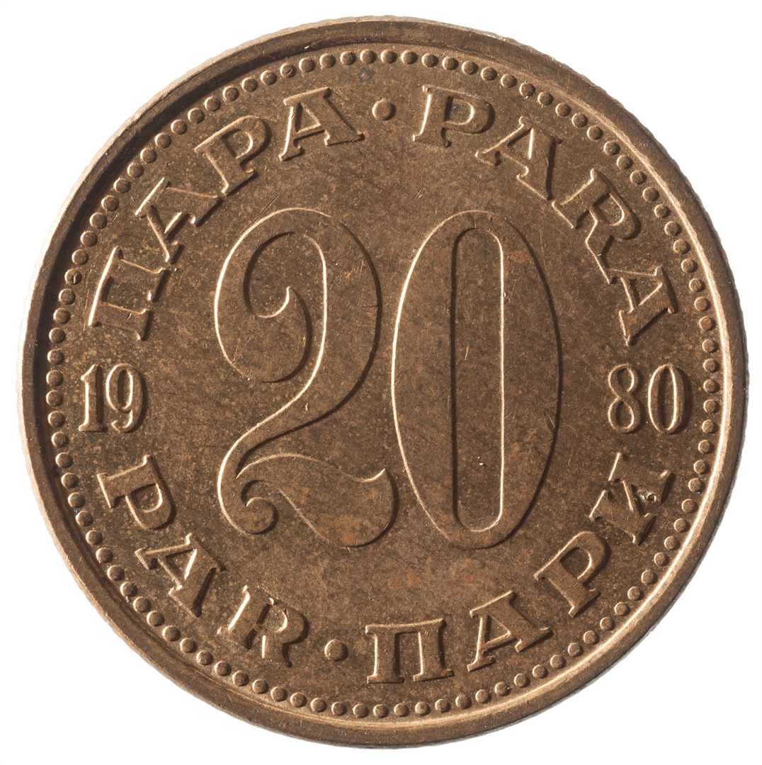 U sredini broj 20 (nominala), a oko njega tekst PARA na četiri jezika. U sredini uz lijevi i desni rub upisana godina 1980.