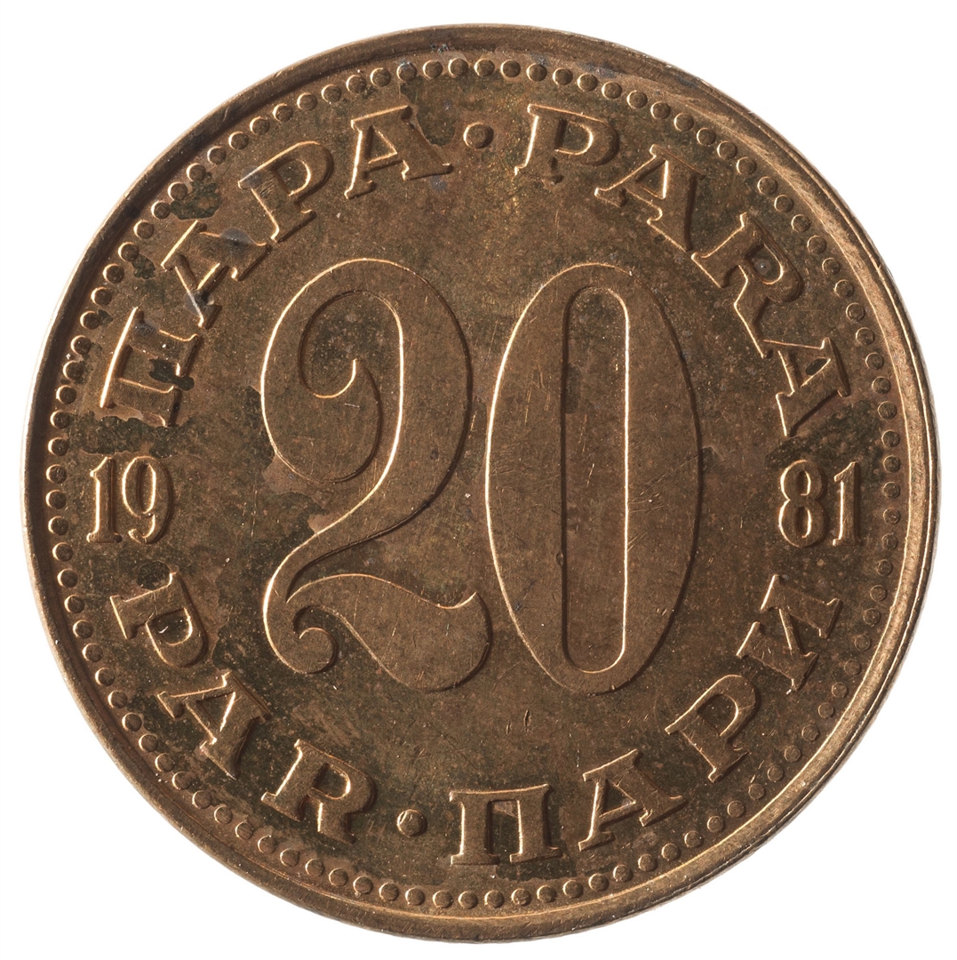 Avers: U sredini državni grb. U gornjem djelu uz rub polukružno napisan tekst SFR JUGOSLAVIJA na latinici i ćirilici. Revers: U sredini broj 20 (nominala), a oko njega tekst PARA na četiri jezika. U sredini uz lijevi i desni rub upisana godina 1981.