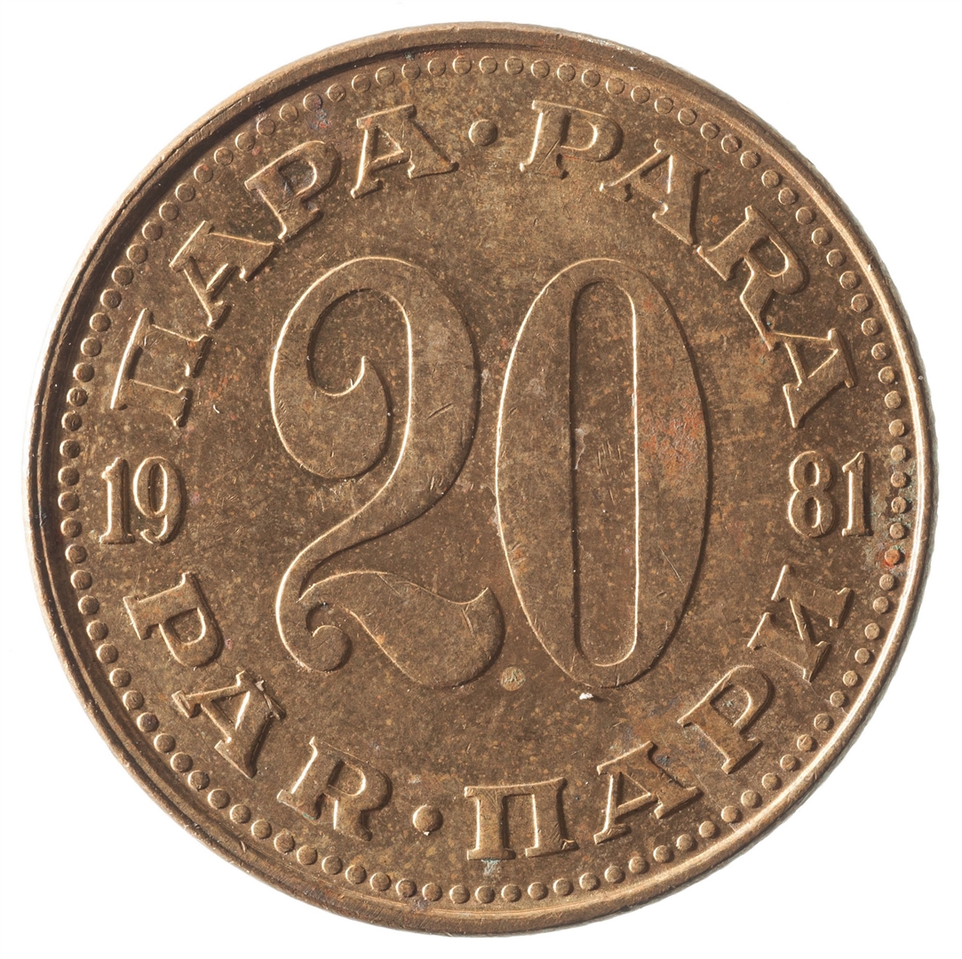 U sredini broj 20 (nominala), a oko njega tekst PARA na četiri jezika. U sredini uz lijevi i desni rub upisana godina 1981.