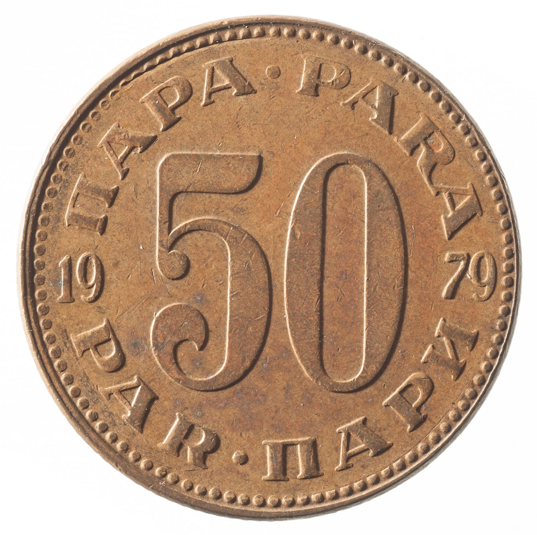 U sredini broj 50 (nominala), a oko njega tekst PARA na četiri jezika. U sredini uz lijevi i desni rub upisana godina 1979.