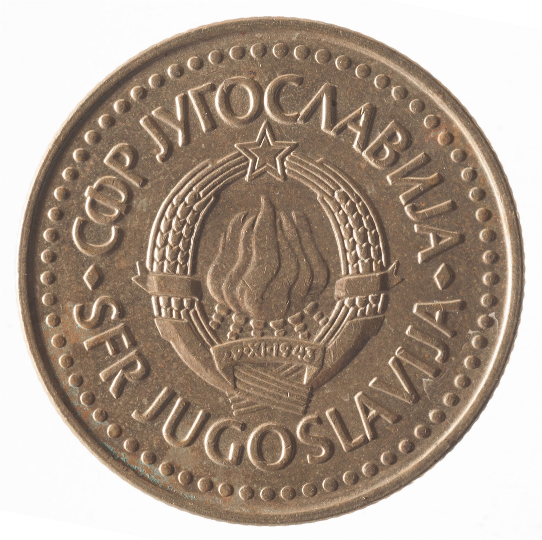 U sredini državni grb. Oko njega uz rub polukružno napisan tekst SFR JUGOSLAVIJA na latinici i ćirilici.