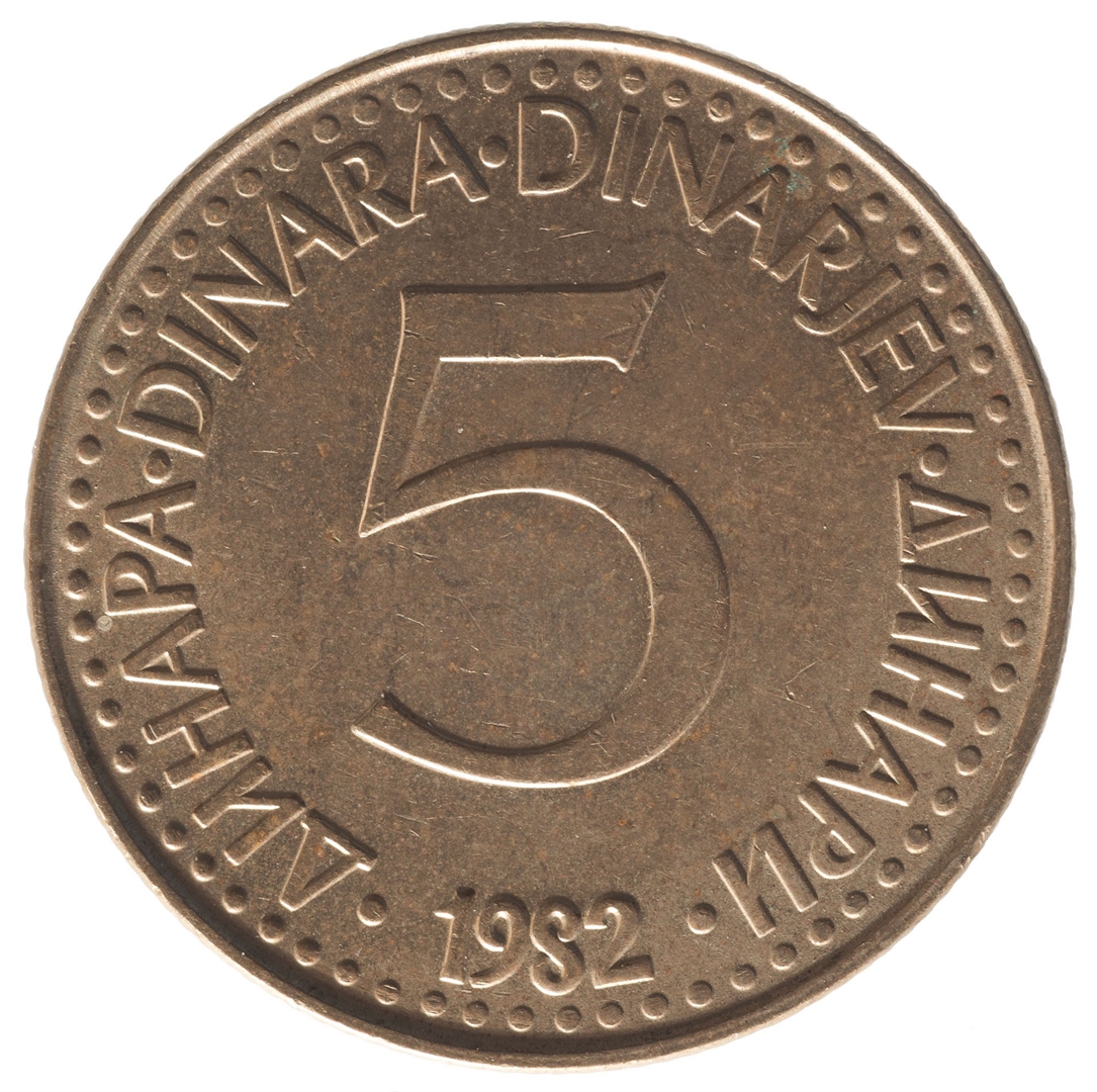 U sredini broj 5 (nominala), oko njega tekst DINAR na četiri jezika, a ispod toga godina 1982.