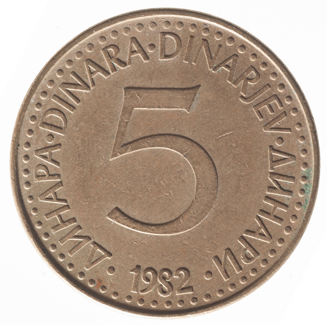 U sredini broj 5 (nominala), oko njega tekst DINAR na četiri jezika, a ispod toga godina 1982.