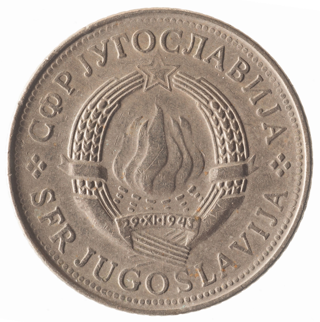 U sredini državni grb. U oko njega uz rub polukružno napisan tekst SFR JUGOSLAVIJA na latinici i ćirilici.
