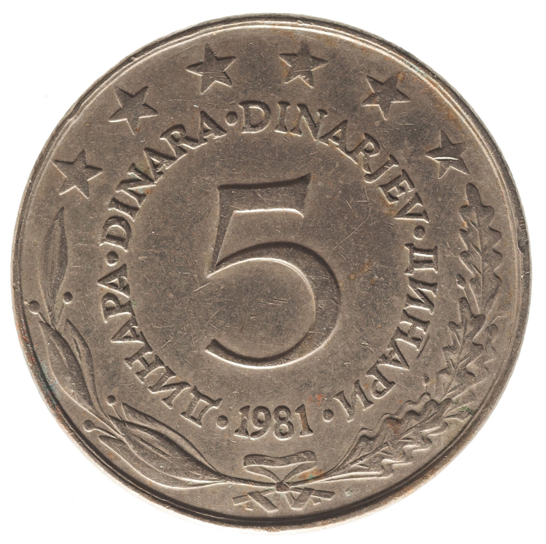 U sredini broj 5 (nominala), oko njega tekst DINAR na četiri jezika, a ispod toga godina 1981. Duž gornjeg ruba polukružno poredano 6 petokrakih zvjezdi.