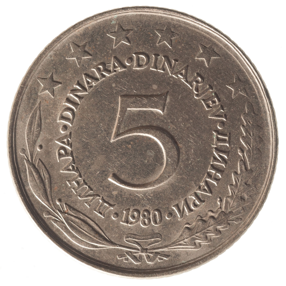 U sredini broj 5 (nominala), oko njega tekst DINAR na četiri jezika, a ispod toga godina 1980. Duž gornjeg ruba polukružno poredano 6 petokrakih zvjezdi.