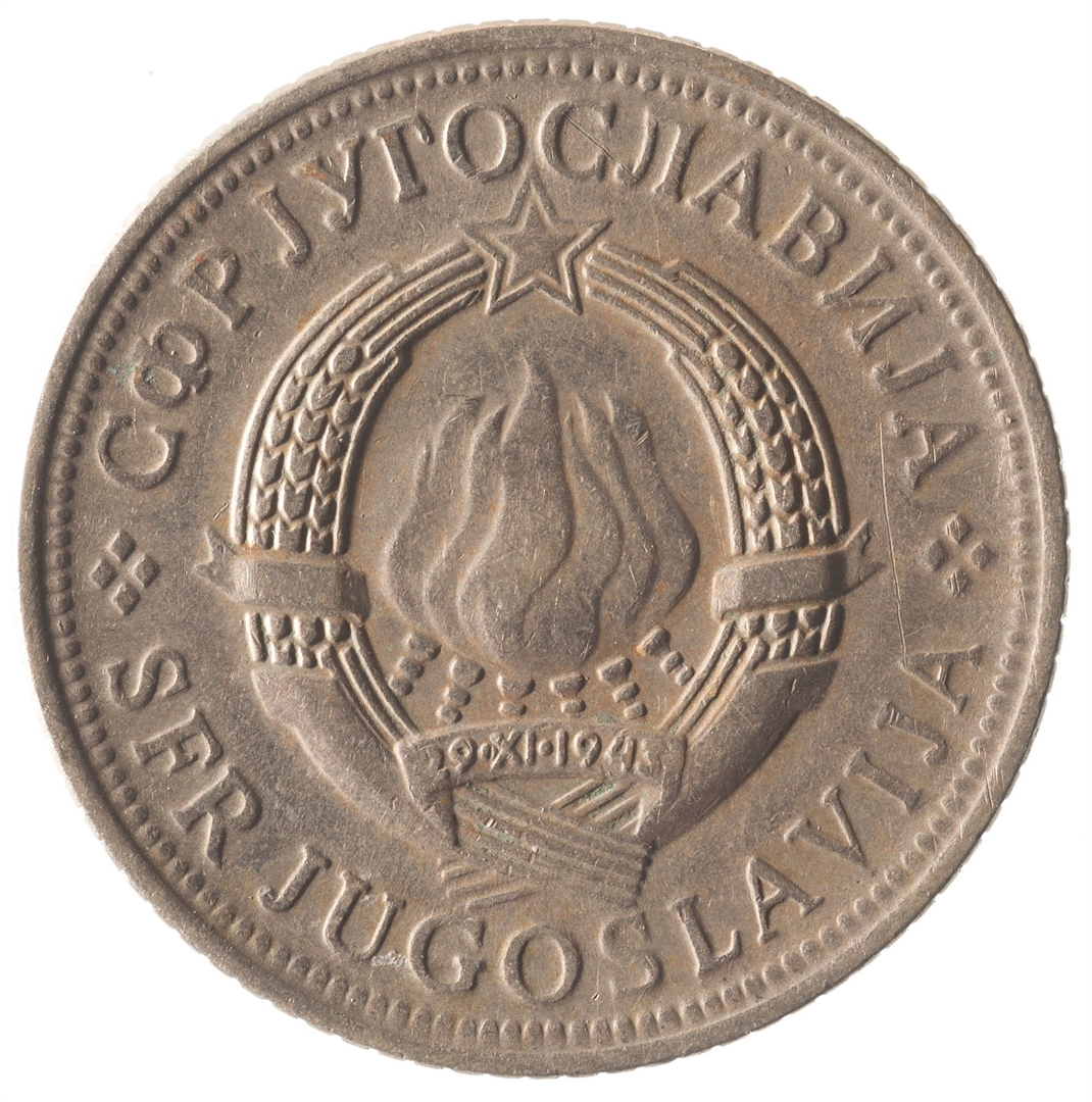 U sredini državni grb. U oko njega uz rub polukružno napisan tekst SFR JUGOSLAVIJA na latinici i ćirilici.