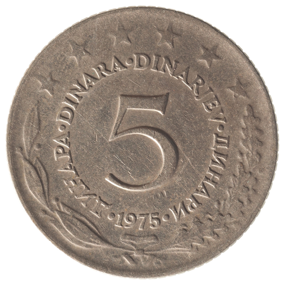 U sredini broj 5 (nominala), oko njega tekst DINAR na četiri jezika, a ispod toga godina 1975. Duž gornjeg ruba polukružno poredano 6 petokrakih zvjezdi.