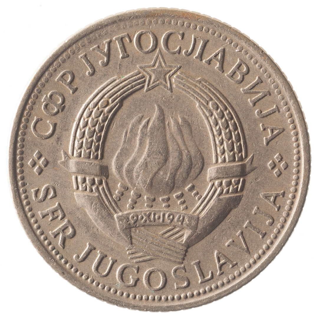 U sredini državni grb. U oko njega uz rub polukružno napisan tekst SFR JUGOSLAVIJA na latinici i ćirilici.