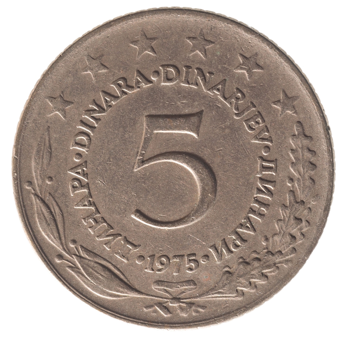 U sredini broj 5 (nominala), oko njega tekst DINAR na četiri jezika, a ispod toga godina 1975. Duž gornjeg ruba polukružno poredano 6 petokrakih zvjezdi.