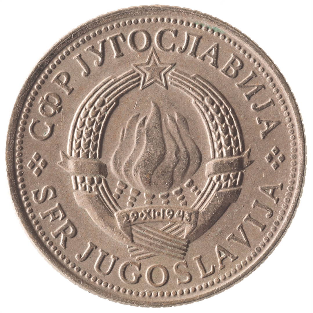 U sredini državni grb. U oko njega uz rub polukružno napisan tekst SFR JUGOSLAVIJA na latinici i ćirilici.