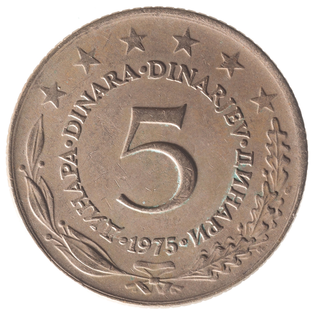U sredini broj 5 (nominala), oko njega tekst DINAR na četiri jezika, a ispod toga godina 1975. Duž gornjeg ruba polukružno poredano 6 petokrakih zvjezdi.